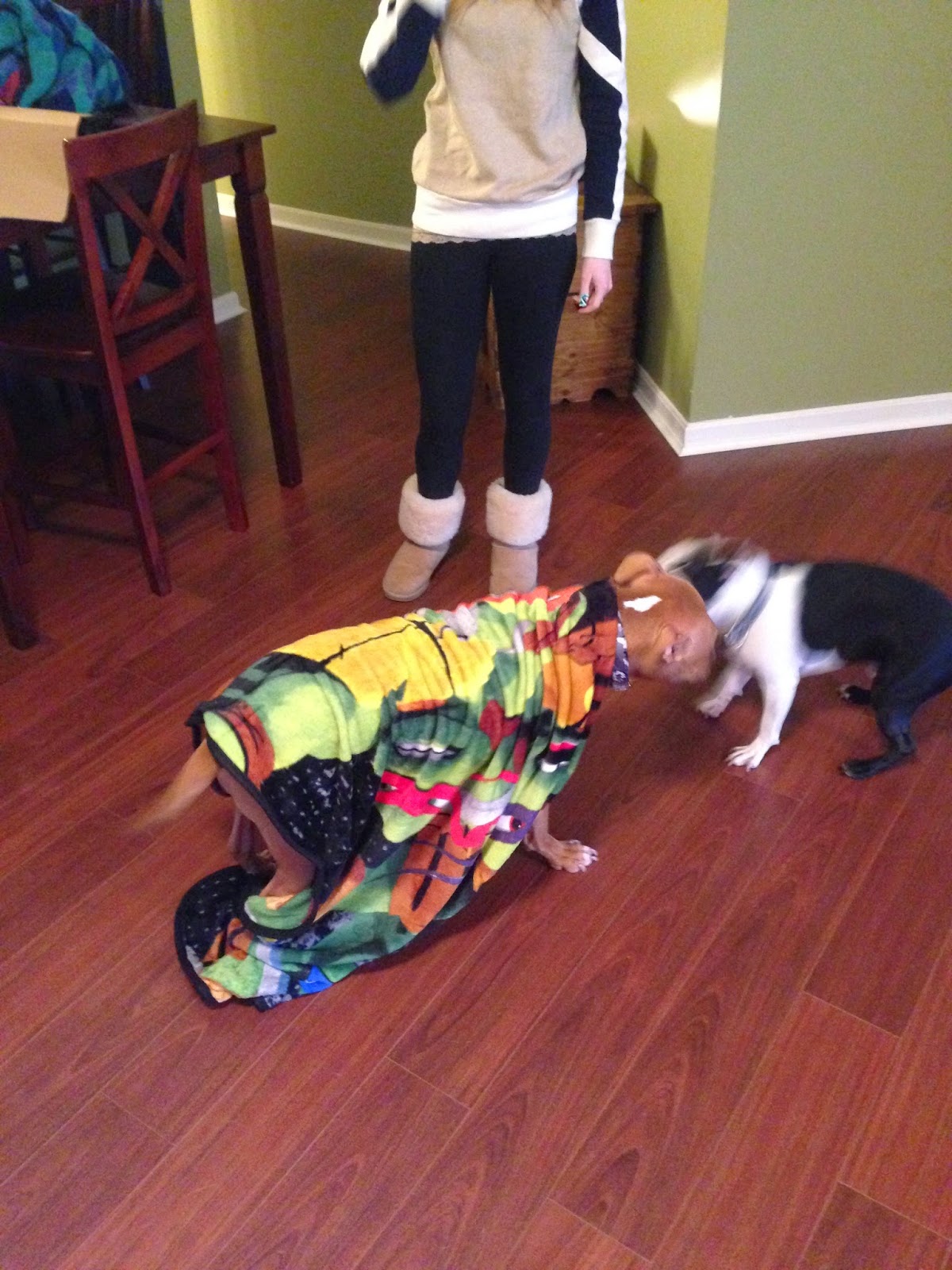 After Chaos devoured his pupcakes he was ready for his present. We gave Ares a sleeping bag for his birthday but while Ares loves the silky fabric and getting all snuggled in his cocoon, Chaos would rather lay on top on something than underneath it. So we got a super soft Teenage Mutant Ninja Turtle blanket that was very enthusiastic about. I couldn’t even get the packaging off before he was trying to get it out of my hands. Needless to say, his present was a good choice and he laid on it most of the rest of the day.